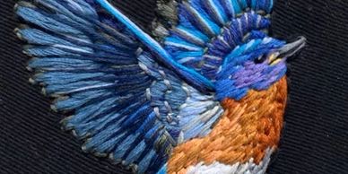 Various hand-embroidered bird projects spread out across 2022-2024. Made as patches or attached to jackets.